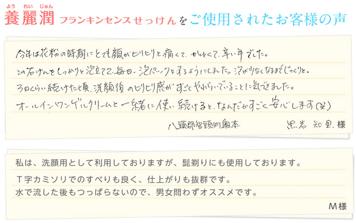 「市販の刺激の強いシャンプー、乾燥した空気やストレスで、ヒリヒリするように頭皮が乾燥して、フケやかゆみで悩んでいたので、養麗潤フランキンセンス石鹸で頭皮を優しく洗って、風呂あがりにゲルクリームをしっとりと浸透させたら、翌朝には頭皮が潤ってきてフケもかゆみもなくなりました。」